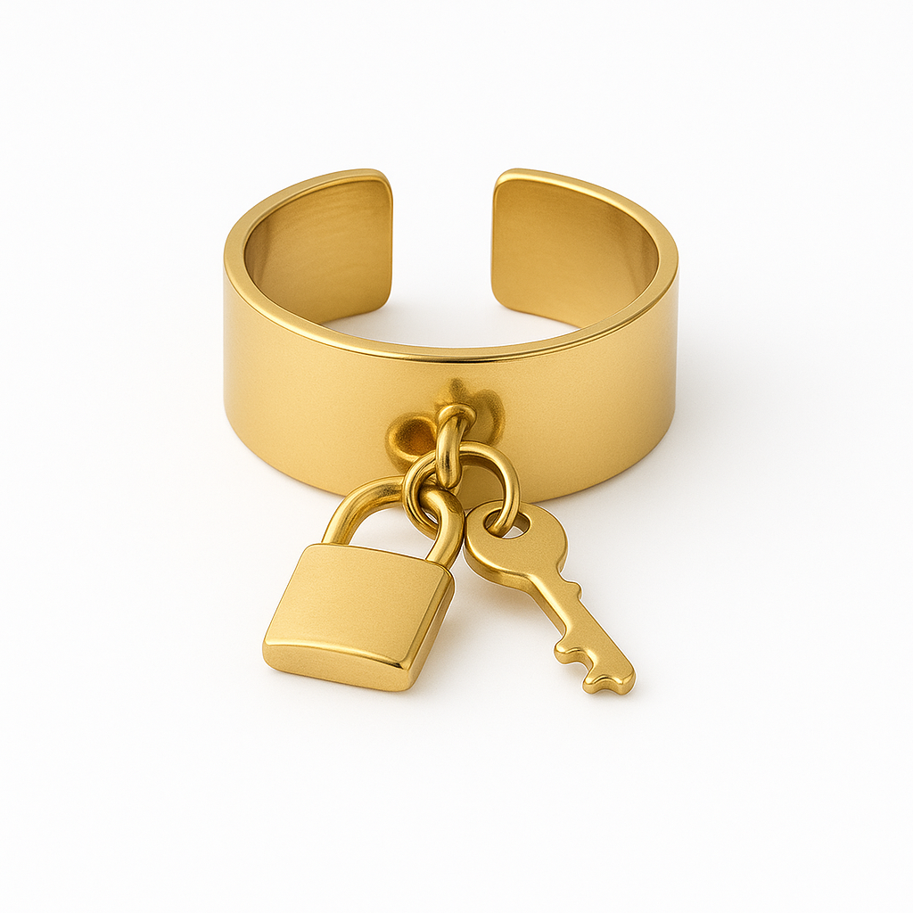Bague Clea – Acier inoxydable doré avec pendentif cadenas et clé